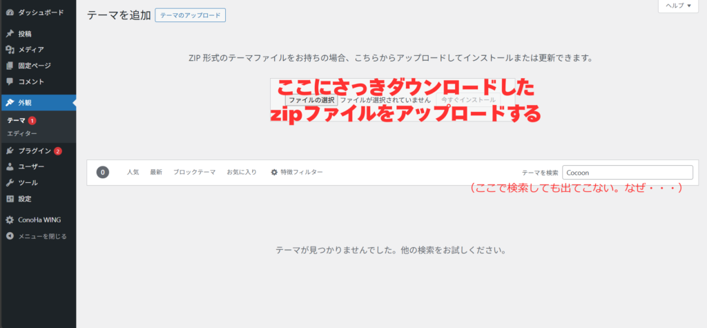 WordPressのインストールが完了し、いざテーマを有効化しようとしたらCocoonが見当たらない。